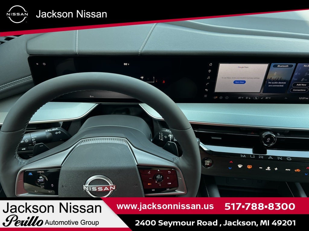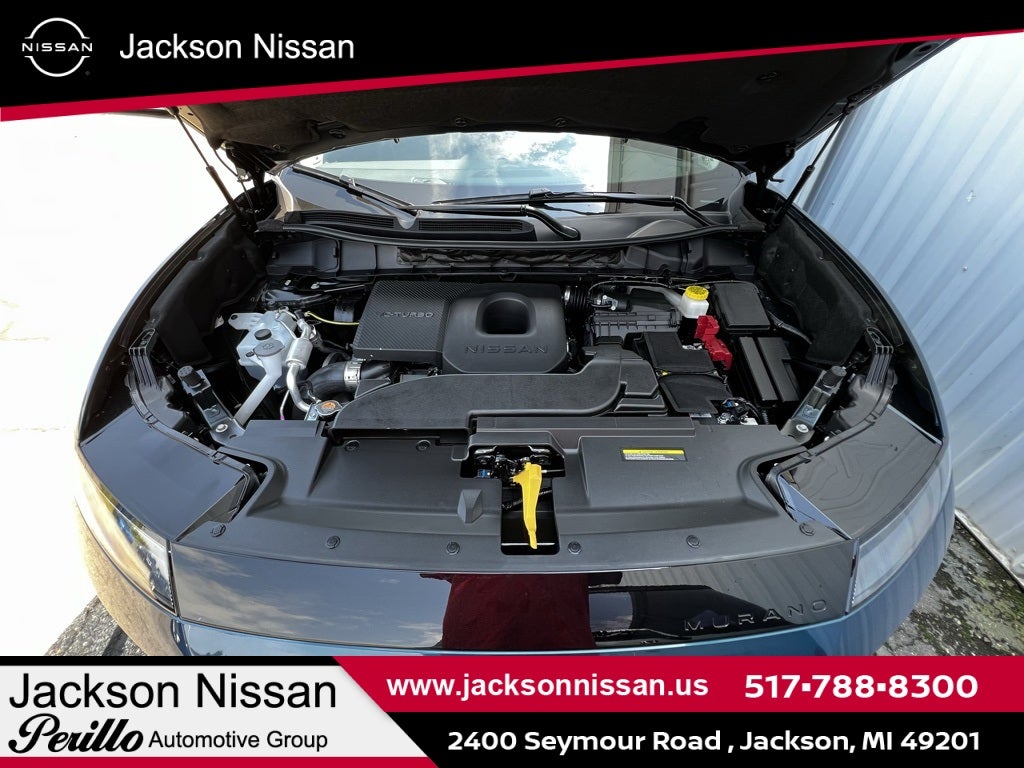 Aurora Blue Pearl Metallic/Super Black 2025 Nissan Murano SL AWD 10 Speakers, 2-Tone w/Premium Paint, 20 Alloy Wheels, 3-Position Cargo Area Protector, 4-Wheel Disc Brakes, ABS brakes, Air Conditioning, AM/FM radio: SiriusXM w/360L, Auto High-beam Headlights, Auto-dimming Rear-View mirror, Automatic temperature control, Brake assist, Bumpers: body-color, Cargo Net, Cargo Package, Carpeted Floor & Cargo Mats, Child-Seat-Sensing Airbag, Compass, Delay-off headlights, Driver door bin, Driver vanity mirror, Dual front impact airbags, Dual front side impact airbags, Electronic Stability Control, Emergency communication system: NissanConnect Services, First Aid Kit, Four wheel independent suspension, Front anti-roll bar, Front Bucket Seats, Front Center Armrest, Front dual zone A/C, Front reading lights, Fully automatic headlights, Garage door transmitter: myQ Connected Garage, Grained Splash Guards, Heated door mirrors, Heated Front Bucket Seats, Heated front seats, Heated steering wheel, Illuminated entry, Knee airbag, Low tire pressure warning, Memory seat, Navigation system: NissanConnect with Navigation and Services, Occupant sensing airbag, Outside temperature display, Overhead airbag, Overhead console, Panic alarm, Passenger door bin, Passenger vanity mirror, Power door mirrors, Power driver seat, Power Liftgate, Power moonroof: Panoramic, Power passenger seat, Power steering, Power windows, PVC (Leatherette) Seat Trim, Radio data system, Radio: NissanConnect w/Hybrid Radio, Rear anti-roll bar, Rear reading lights, Rear seat center armrest, Rear side impact airbag, Rear window defroster, Rear window wiper, Remote keyless entry, Retractable Cargo Cover, Security system, Speed control, Speed-Sensitive Wipers, Split folding rear seat, Spoiler, Steering wheel mounted audio controls, Tachometer, Telescoping steering wheel, Tilt steering wheel, Traction control, Trip computer, Turn signal indicator mirrors, USB Charging Cables, Variably intermittent wipers, Wireless Apple CarPlay/Wireless Android Auto.