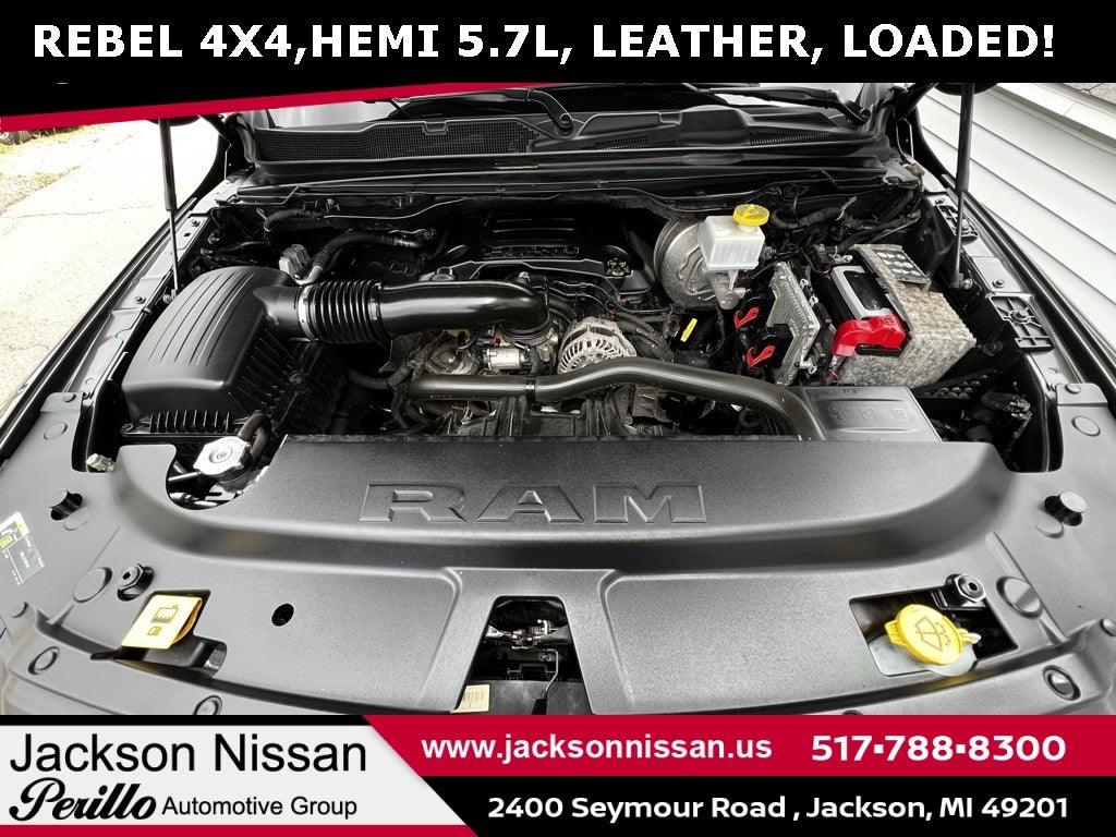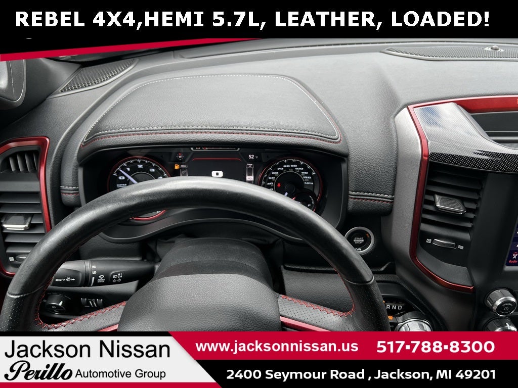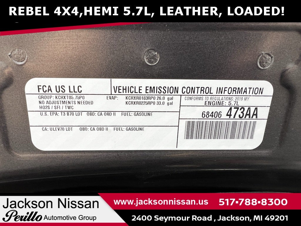Recent Arrival! 2019 Ram 1500 Rebel Granite Crystal Metallic Clearcoat New Arrival, TRAILER TOW PACKAGE, CREW CAB, PRICED TO SELL!, EXCEPTIONALLY WELL EQUIPPED!, 1-Year SiriusXM Radio Service, 3.92 Rear Axle Ratio, 4-Wheel Disc Brakes, 48V Belt Starter Generator, 6 Speakers, 8.4 Touchscreen Display, ABS brakes, Air Conditioning, Alloy wheels, AM/FM radio: SiriusXM, Apple CarPlay, Auto-Dimming Exterior Driver Mirror, Auto-Dimming Rear-View Mirror, Body Color Door Handles, Brake assist, Cloth/Vinyl Low Back Bucket Seats, Compass, Delay-off headlights, Driver door bin, Dual front impact airbags, Dual front side impact airbags, Electronic Stability Control, Exterior Mirrors Courtesy Lamps, Exterior Mirrors w/Supplemental Signals, Foam Bottle Insert (Door Trim Panel), For More Info, Call 800-643-2112, Front anti-roll bar, Front Bucket Seats, Front Center Armrest w/Storage, Front fog lights, Front reading lights, Front wheel independent suspension, Fully automatic headlights, Google Android Auto, GPS Antenna Input, Heated door mirrors, Heated Front Seats, Heated Steering Wheel, Illuminated entry, Integrated Center Stack Radio, Leather steering wheel, Low tire pressure warning, Manufacturer's Statement of Origin, Occupant sensing airbag, Outside temperature display, Overhead airbag, Overhead console, Panic alarm, ParkView Rear Back-Up Camera, Passenger door bin, Passenger vanity mirror, Power Adjustable Pedals, Power Black Trailer Tow Mirrors, Power door mirrors, Power driver seat, Power Heated Fold Away Mirrors, Power steering, Power windows, Power-Folding Mirrors, Quick Order Package 25W Rebel, Radio data system, Radio: Uconnect 3 w/5 Display, Radio: Uconnect 4 w/8.4 Display, Rear anti-roll bar, Rear Dome w/On/Off Switch Lamp, Rear seat center armrest, Rear step bumper, Rear Wheelhouse Liners, Rear Window Defroster, Rebel Level 1 Equipment Group, Remote keyless entry, Remote Start System, Single Disc Remote CD Player, SiriusXM Satellite Radio, Speed control, Split folding rear seat, Steering wheel mounted audio controls, Sun Visors w/Illuminated Vanity Mirrors, Tachometer, Telescoping steering wheel, Tilt steering wheel, Traction control, Trailer Brake Control, Trailer Tow Group, Trailer Tow Mirrors, Trip computer, Universal Garage Door Opener, Variably intermittent wipers, Voltmeter.